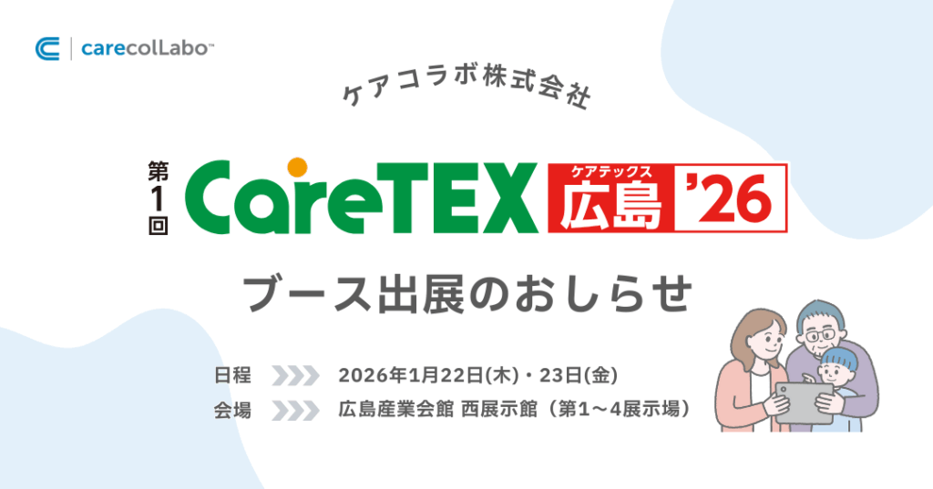 2026年1月22日(木)・23日(金) に開催される 第1回 CareTEX広島’26 に、ケアコラボがブース出展します。ケア記録のICT化に興味をお持ちの場合は、ぜひケアコラボブースにお気軽にお立ち寄りください!