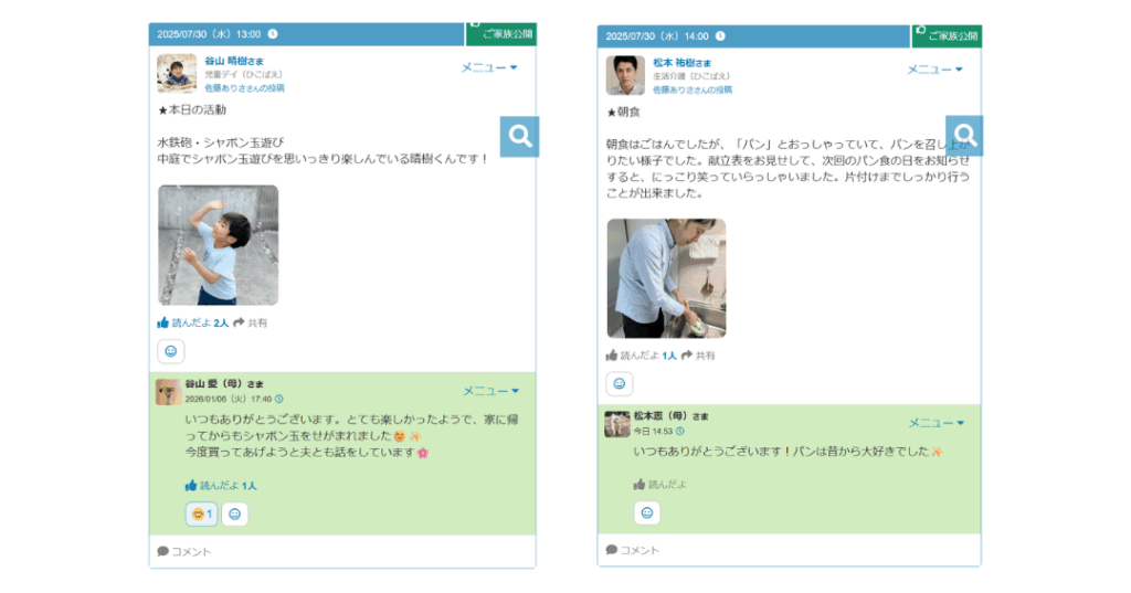 記録を通じてご家族と情報を共有することは、ご家族と事業所が協力してご利用者を支える協力体制の基盤となります。