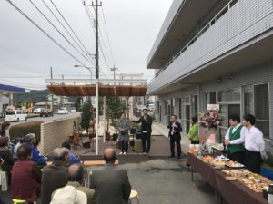 当日は、近所の方やご利用者様、そのご家族、関係者のかたでとても盛り上がっていました。 道路を挟んだ向かいにあるガソリンスタンドのスタッフの方が、式のあいだ、ずっと脱帽して拝聴されていたのが印象的でした。