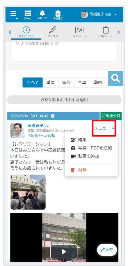 これまでは、タイムライン上の投稿を編集する際、「編集」ボタンを押した後に、写真・PDFの追加・削除や、投稿そのものの削除を行う必要がありました。