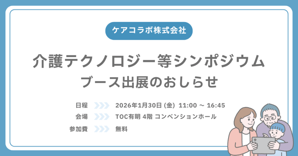 2026年1月30日 (金)、TOC有明にて開催される「介護テクノロジー等シンポジウム」(主催:厚生労働省・経済産業省連携事業)に、ケアコラボが出展いたします。今の記録方法に課題を感じている方や、まずは最新の情報を知りたいという方も、ぜひお気軽にブースへお立ち寄りください!